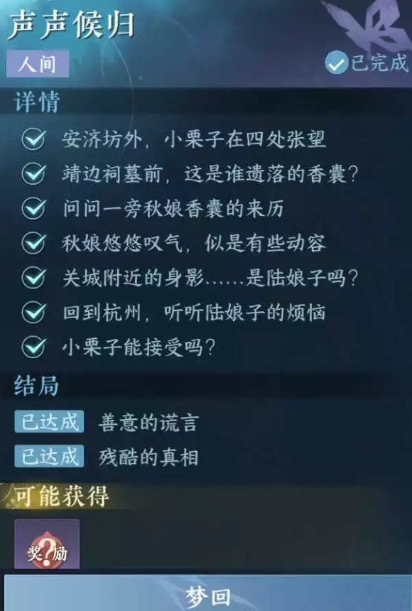注:本人间任务有2个结局,可在本区域的人间任务列表进行梦回