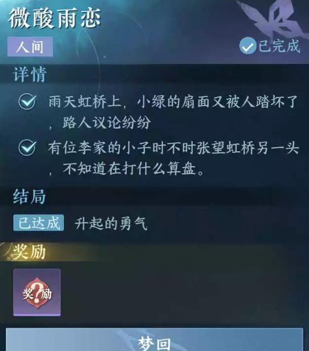 以上就是《逆水寒手游》人间任务微酸雨恋任务攻略的全部内容 ,更多逆水寒手游相关攻略点击逆水寒手游专区查看!