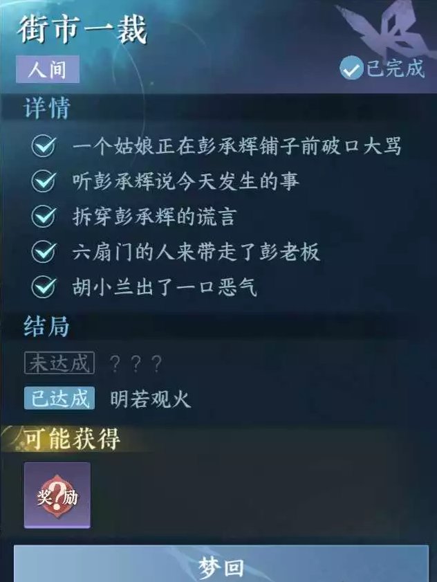 注:本人间任务有2个结局,可在本区域的人间任务列表进行梦回