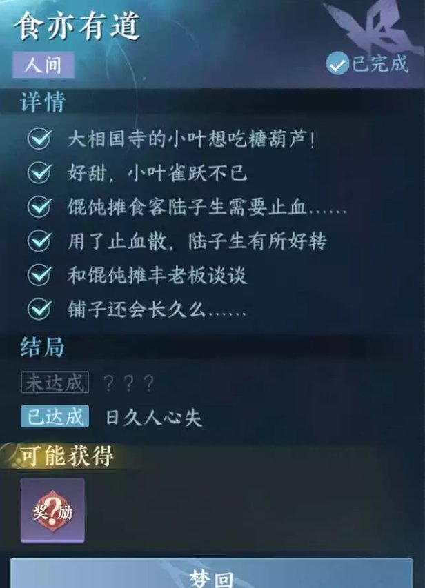 注:本人间任务有2个结局,可在本区域的人间任务列表进行梦回