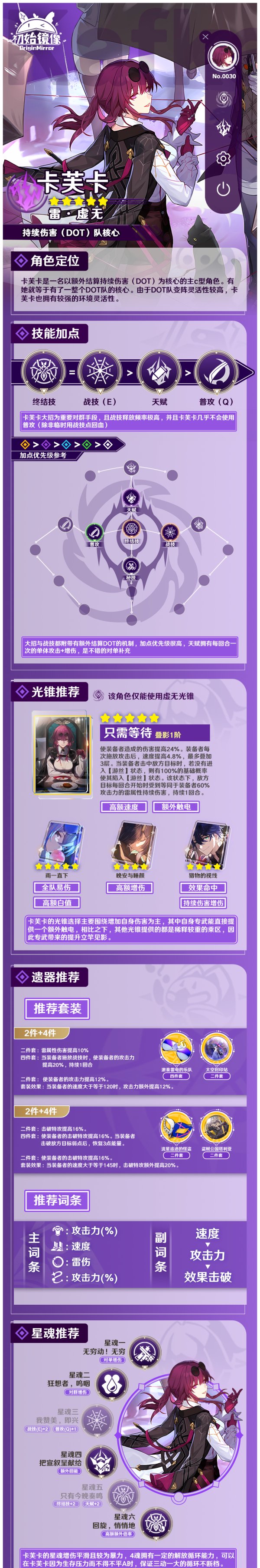 卡芙卡,雷属性,虚无命途,是持续伤害(DOT)体系的核心角色,以战技和大招额外结算持续伤害为核心,相当于为持续伤害配队提供了一个独立乘区,于此同时,自身的出伤能力不弱,卡芙卡的定位类似于主c,但是相对于其他主c,体系较为独立,且该角色在体系内不可被替代。卡芙卡的机制很强势,对应的成本自然也很高,卡芙卡自身追求高速多动且每回合都会释放战技来高频引爆DOT,所以对战技点的需求量很高,配队时需要注意这点。