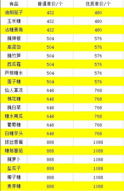 【食品加工】:所有蓝色的普通食物配方都为6个食材+1配料,所有优质食物的配方为4个优质食材+1配料或者1个变异食材+1配料,单个食品价格如上图。