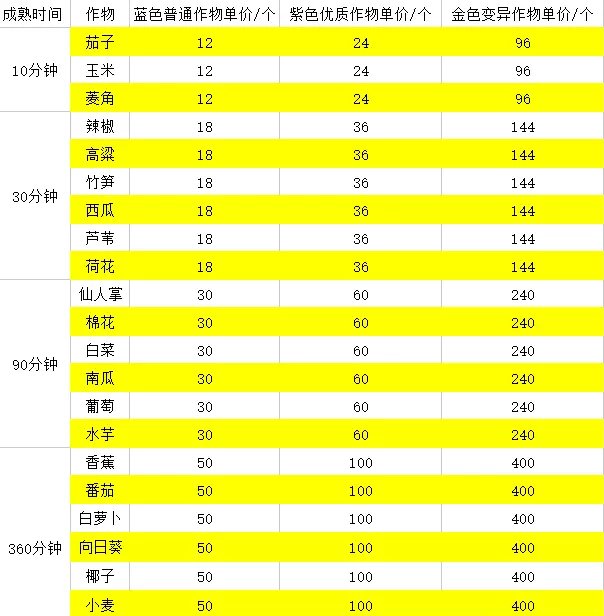 这是每种作物的成熟时间与单价,按照单价来算,如果是时间多的玩家,长期在线可以选择10分钟的作物,成熟时间快,相同时间下的产物所卖出的资材也是最多,不想那么累的可以选择360分钟的作物,时间长,直接卖价格较低,【再加工】之后价格较高,这里推荐全部种【椰子】或者【小麦】,单一作物后面再加工时也方便。