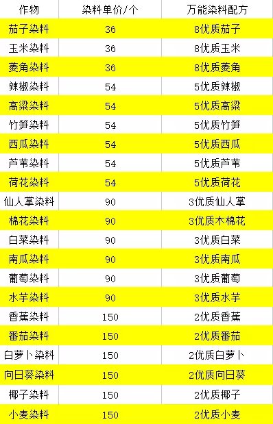 【染色剂】:以上所有普通染料都为2个蓝色作物制作,所有紫色的优质作物都可加工为【万能染料】,出售价格为270/个,只是配方所需要数量不同。