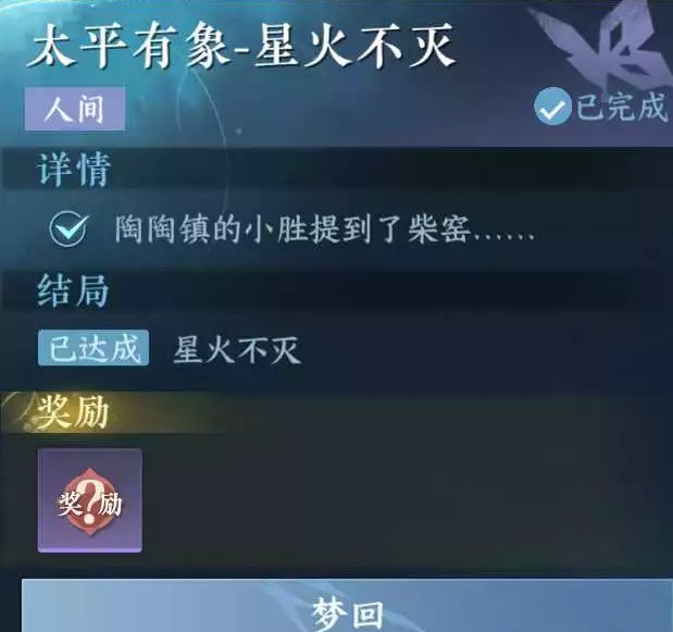 注:有前置!需要完成呼吸—红尘行歌中最后一个太平有象任务才能触发,并且结局时需要选择“为赵兴隐瞒”