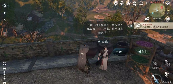 2、到雁门关385.893处与NPC“楚淮”对话并提交“一盒花烛”即可完成任务