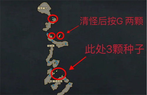 伯尼尔森林摩可可种子的位置一共有两个,分别在地图的右上角和左下角。种子所在区域有大量怪物守卫,需要玩家做好战斗准备。右下角的种子点需要先通过右侧隐藏通道,进入小岛后才能获得。