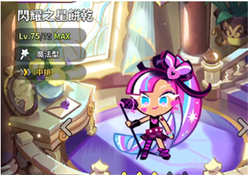 闪耀之星饼干是魔法型中排角色。拥有出色的攻击和体力,适合输出。其技能“唱歌”可以对敌人造成伤害,无视敌人的抗性,使它对于高体力的对手有很大威胁。技能还提供友方精神增益,增加暴击伤害抵抗。此效果受技能的暴击次数影响。
