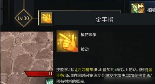 - 第二点优先将采集升级到30级,能得到一个技能叫做金手指,具体作用就是先采集,然后叠5层buff,然后加快采集速度。像我这样手臂冒出金色的光,就是触发了金手指。