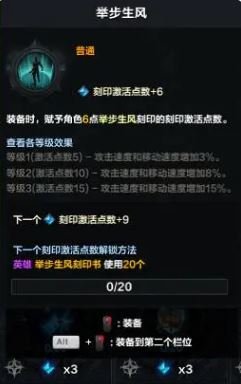 首先我们打开角色界面,点击上方的【刻印】即可进入刻印系统,每个刻印有十五个蓝豆,升级需要刻印书,20本绿色的书=3个蓝豆,20蓝=6,20紫=9,20金=12。又以五个蓝豆为一级,一共三级。好消息是国服上线取消了绿色,全部刻印3点,主线会送红框内蓝色的刻印(6点)。都是偏防御和傻瓜攻击向的刻印,比如这个举步生风,效果是增加攻速和移速,肝主线的时候非常适合跑图赶路和快速刷怪。