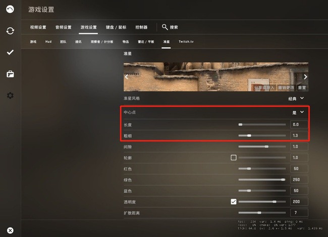 2、进入之后,在游戏设置中找到准心这一栏,然后按照如图所示的设置进行设置。