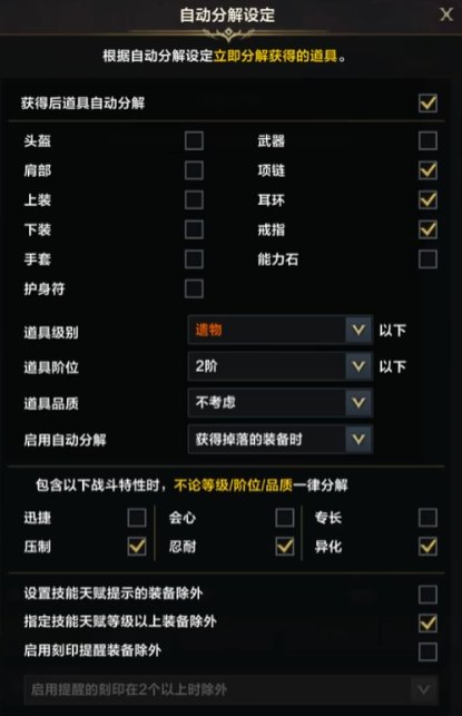 玩家在游戏挑战副本的过程中,经常会出现装备爆满背包溢出的状况,对于一些无用的装备属性如异化、忍耐、压制,我们就可以打开背包的自动分解,帮助我们清理背包的空间剩下属性好的装备可以在交易行赚取金币。可以如下图中设置