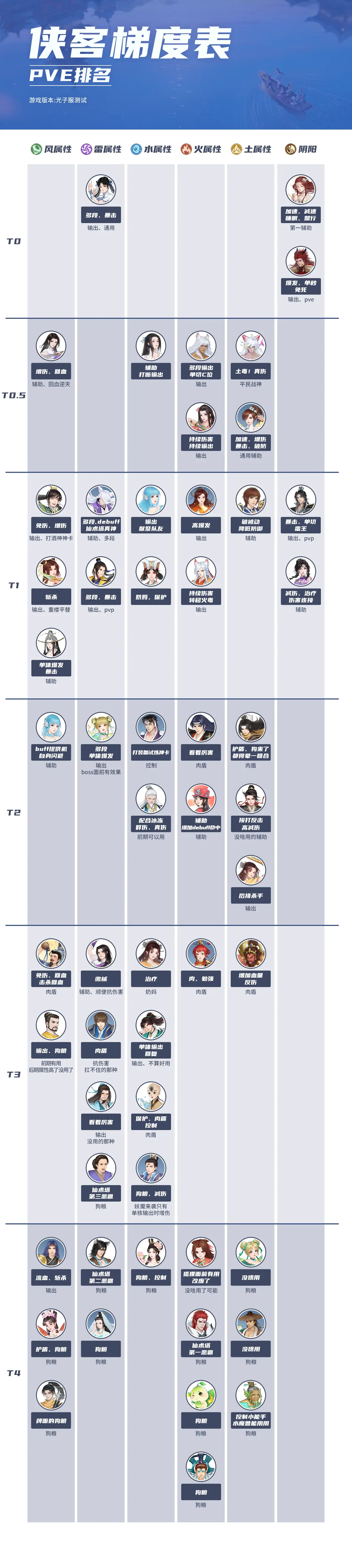 1、角色强度排行榜如图所示,同一梯队的侠客排名不分先后,大家可以参考排行进行培养