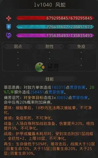 BOSS:风蛇*2,满毒+降低攻速+快速破双盾减少战痕层数叠加,以常规极冰队举例:开局极冰快速战吼,分别战吼2只BOSS破物盾,寒血诅咒战吼破魔盾,由于战斗时长达2分钟,可无视推荐战吼方式,直接尝试叠满毒击杀即可;若缺少减疗装备,可替换辅助为树灵茵娜等。