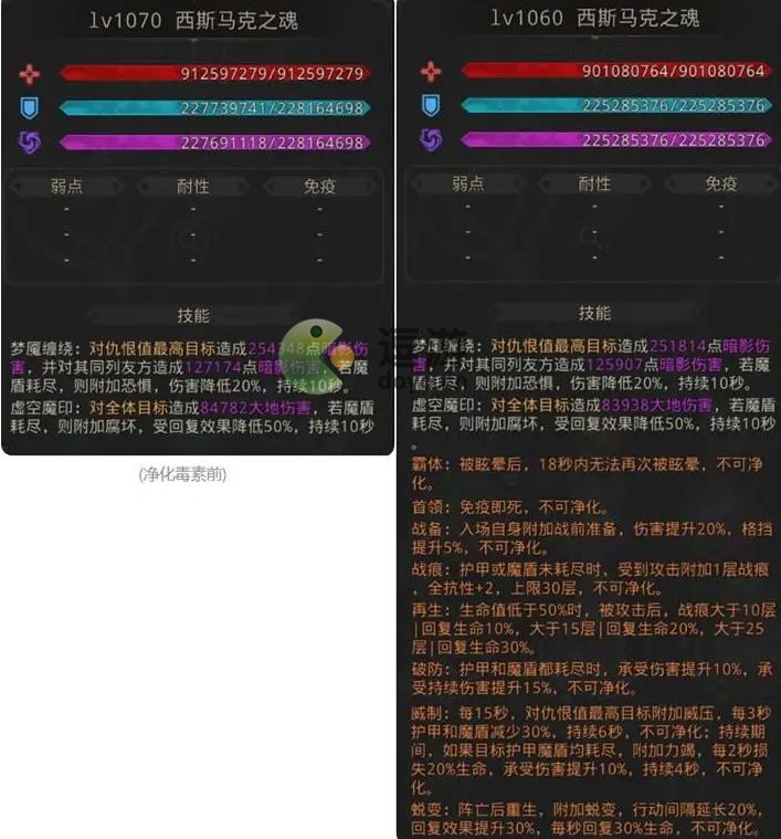 6、[逐星]无名墓园:若[逐星]世界树根部吸纳的毒素未净化,则BOSS属性增强,辅助可配置牺性符文,回复护甲魔盾减少主坦力竭几率;满毒+降低攻速+快速破双盾减少战痕层数叠加;以常规极冰队举例:开局快速极光战吼1~2次破物盾后,深海吼,寒血诅咒+极光战吼破魔盾;由于战斗时长达2分钟,可无视推荐战吼方式,叠满毒击杀即可,若缺少减疗装备,可替换辅助为树灵茵娜等。