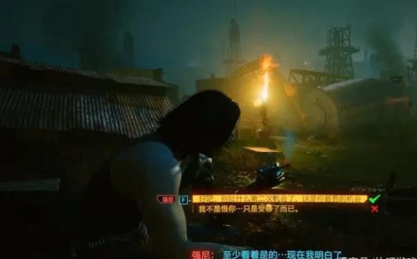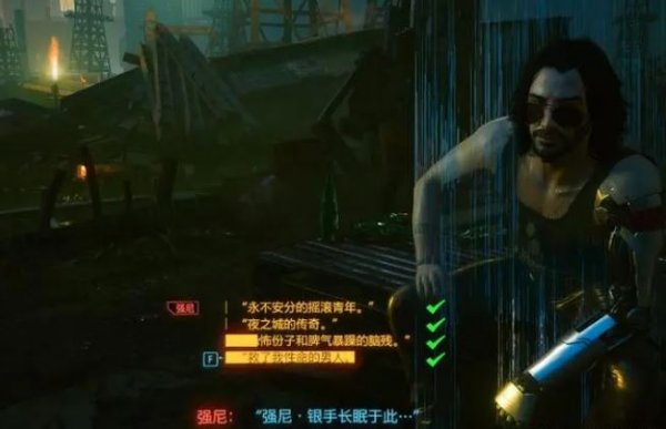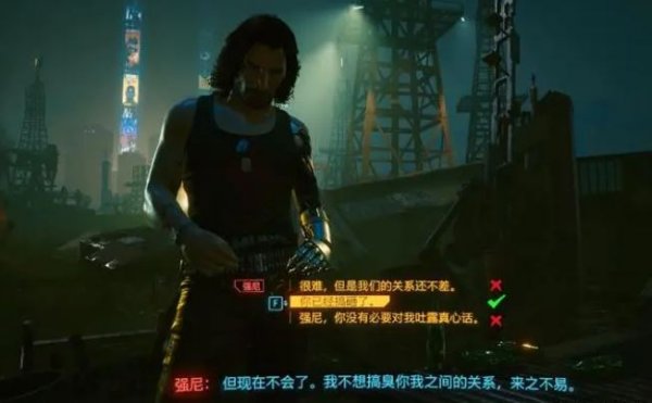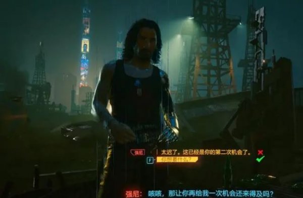 玩家首先和强尼·银手对话,此处的四个选项都可以选,如果不想多看剧情的话推荐选择第四个选项直接到达第二个选择。
