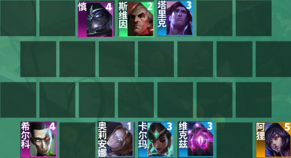 7人口由蚂蚱、发条、乌鸦、宝石、大眼、希尔科、慎组成6法师、2堡垒羁绊。