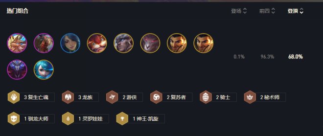 2、主要阵容羁绊:3复生亡魂 3龙族,3复生亡魂优先推荐翠神,末日使者,不灭狂雷,3龙族优先推荐正义巨像,寒冰射手,大发明家,剩余的可以根据阵容搭配,或者直接上5费卡;