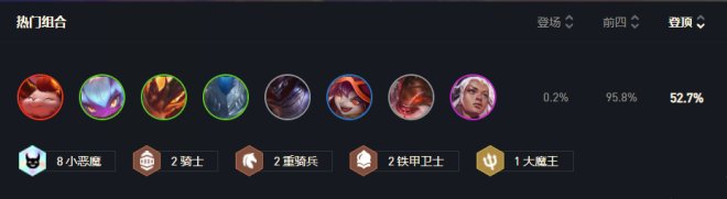 5、主要阵容羁绊:8小恶魔,这套阵容关键是小恶魔转职;搭配迅捷斥候,麦林炮手,暴怒骑士,狂暴之心,爆破鬼才,仙灵女巫,圣锤之毅筹齐8小恶魔羁绊,小恶魔转职可以根据阵容和抽卡选择英雄佩戴;这套阵容最好需要2个恶魔转职其中一个用来替换圣锤之毅,组成更好的阵容羁绊;