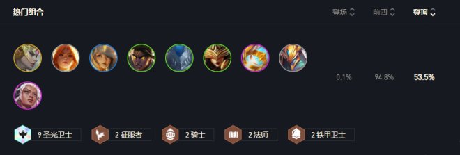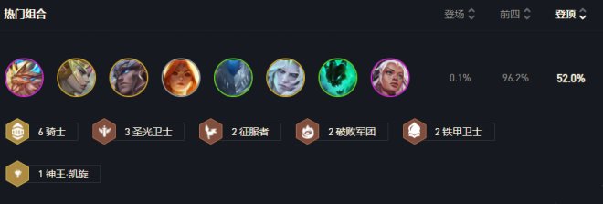 7、主要阵容羁绊:6骑士 3圣光卫士,正义巨像,曙光女神,德玛西亚之力,深海泰坦,魂锁典狱长再加上一个骑士转职组成6骑士,3圣光选择熔铁少女,曙光女神,正义天使,骑士转职可以看需要给到破败之王或者荣耀行刑官;