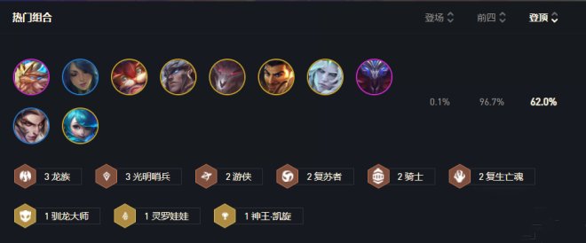 3、主要阵容羁绊:3龙族 3光明哨兵,3龙族优先推荐正义巨像,寒冰射手,大发明家,3光明哨兵优先推荐影哨,正义巨像,幻翎,剩余的可以根据阵容搭配,或者直接上5费卡;