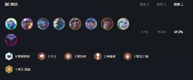 4、主要阵容羁绊:8黎明使者,这套阵容关键是黎明使者转职;搭配众星之子,天启者,狂野女猎手,德玛西亚之力,放逐之刃,酒桶,虚空掠夺者组成8黎明使者羁绊,黎明使者转职可以根据阵容和抽卡选择英雄佩戴;