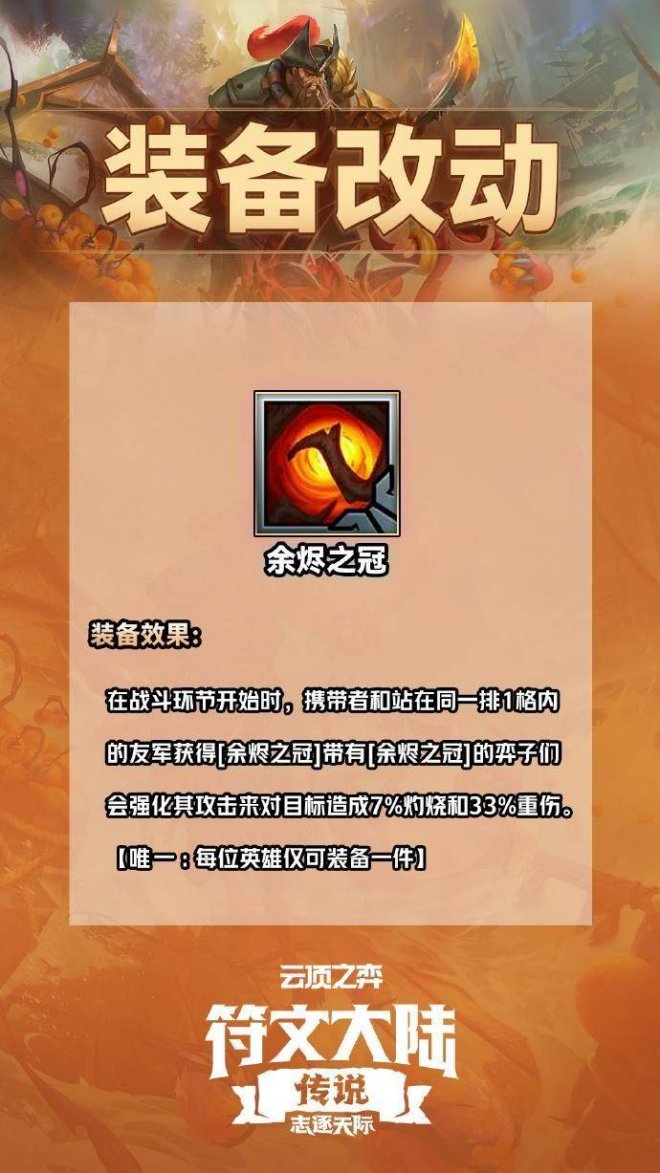 效果:在战斗环节开始时,携带者和站在同一排1格内的友军获得【余烬之冠】。带有【余烬之冠】的弈子们会强化其攻击来对目标造成7%灼烧和33%重伤