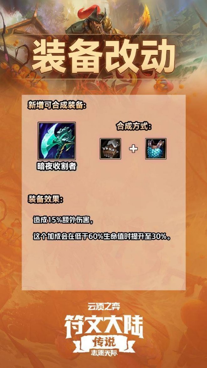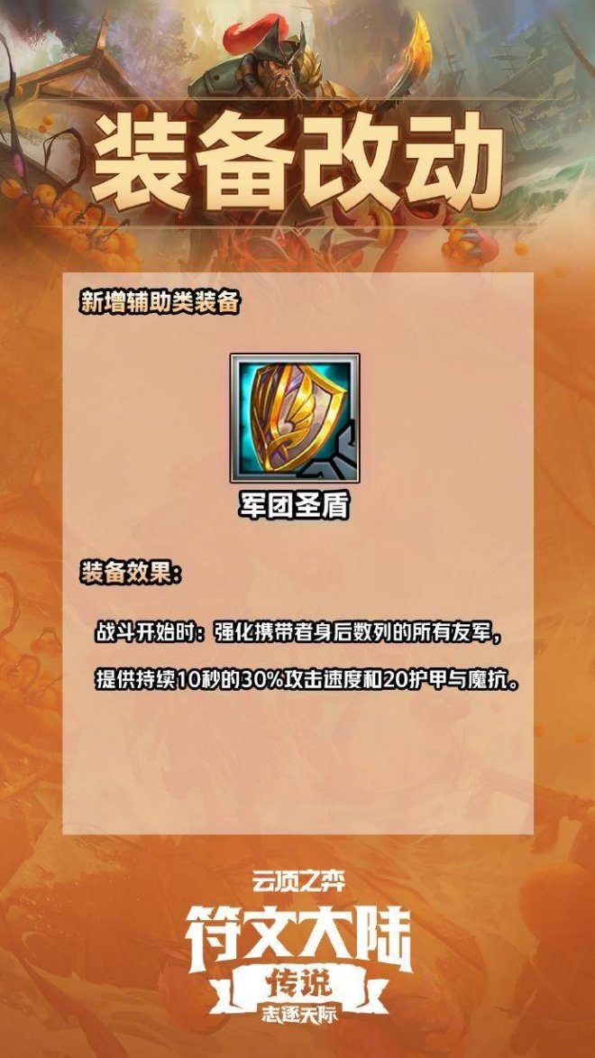 效果:战斗开始时:强化携带者身后数列的所有友军,提供持续10秒的30%攻击速度和20护甲与魔抗