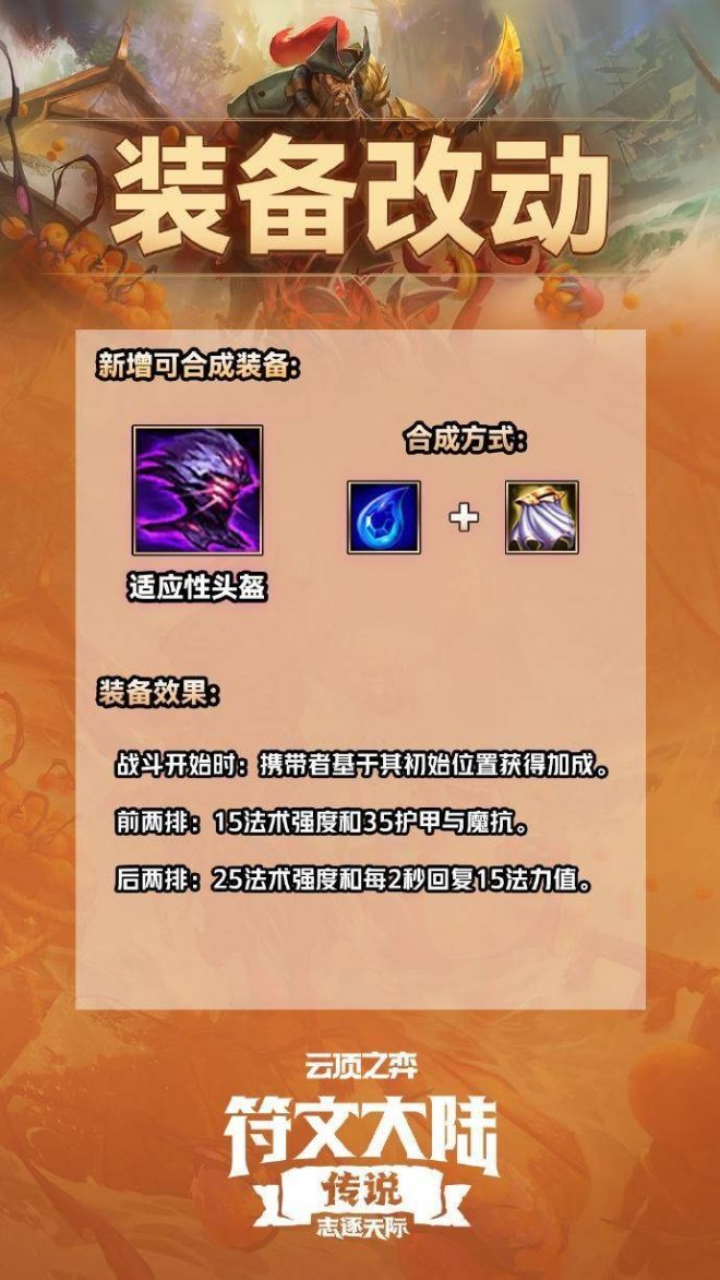效果:战斗开始时:携带者基于其初始位置获得加成。前两排:15法术强度和35护甲与魔抗。后两排:25法术强度和每2秒回复15法力值。