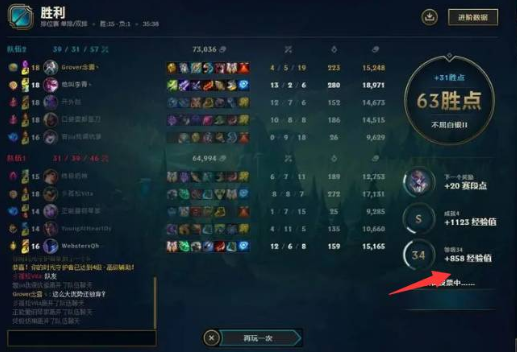 3、在其他游戏对局结算界面可以看到会加等级经验。