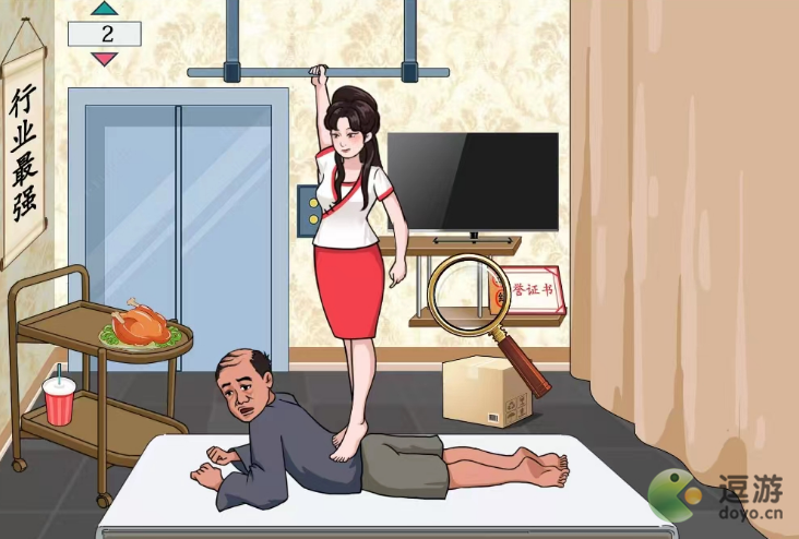 1、汉字找茬王夺命按摩店,需要砍下按摩价格,首先使用放大镜找到:行业最坑、-18层、杠铃、护目镜、新闻、滑冰鞋、名片(大郎左手边)、箱子里的工具、鸡骨头、杯子里的液体、被打的客人(界面右侧)、通缉令(电视下方)