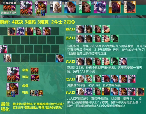 八人口有裁决转,直接开6裁决,找剑魔,提升很大,如果有万用瞄准镜可以上2个铁男,猪妹可以用优质五费卡替代,没转职就这套8人口全2星也能稳前3!