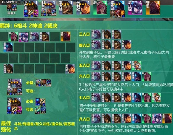6人口格子不好就可以换4斗格子不好优先挂6斗,但是要先把4斗找出来,因为有蛇女副C不缺伤害,可以慢慢上人口。同样格子不好优先换6斗,同行内战重点是挂卑尔维斯百分比伤害杀虫子,米利欧可以换成大头或者瑞兹。