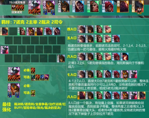 诺克找两星铁男大提升强度,有火炮直接多-一个副C位要强势很多八人口找一-张剑魔阵容成型,没有双重或者诺克转高分段不建议强行玩,虽然是版本最强阵容之- -, 注意做好对位,狗子要早点送死给莎弥拉。