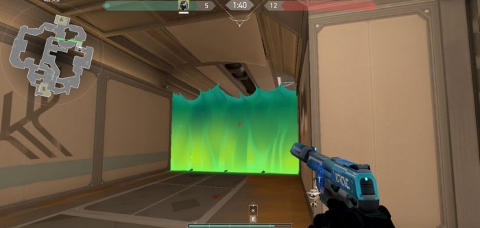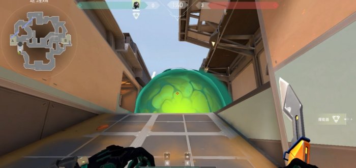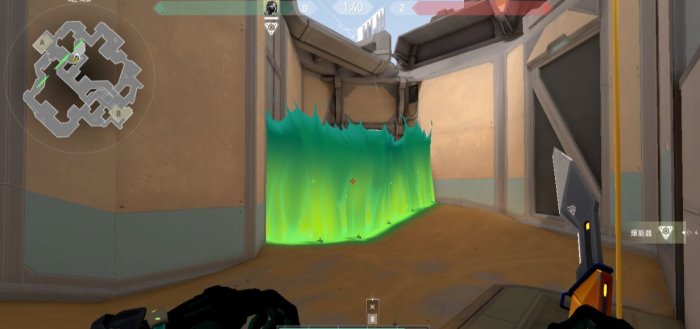 我们开局站在绳索区的二楼,抢A小门,这个时候有炼狱的强化信标就非常好抢,通过这个毒幕,抢敌人出烟的timing
