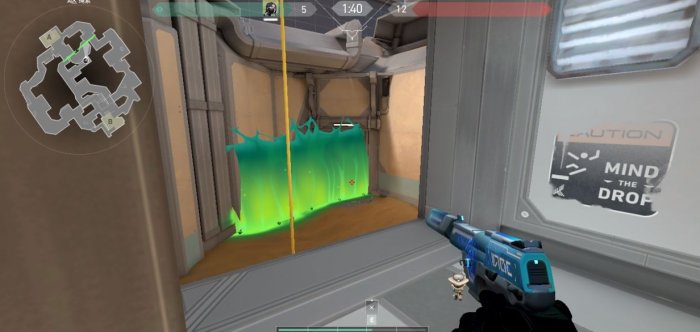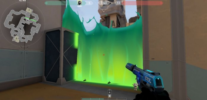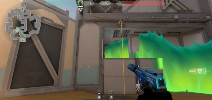 我们从后面进攻A点,前进到能如图放置遮挡住A小门的毒幕,摸得时候要小心,别被出来的敌人打死了,有队友就让队友架一下枪。