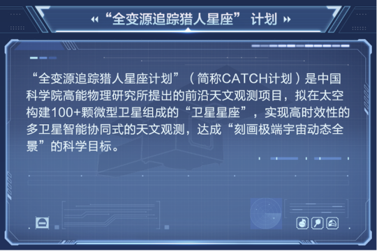 与太阳基地毗邻的地球基地其核心建筑内的展列是中国科学院高能所合作的粒子天体物理重点实验室“全变源追踪猎人星座”计划(简称Catch计划)项目的科普植入。展厅内通过计划相关的卫星模型和墙面科普消息展示,向玩家们介绍Catch计划的相关信息。