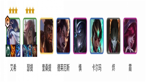 1.这套阵容的核心棋子寒冰、腕豪、诺手、慎、卡尔玛、烬和霞都具有不俗的战斗力和职业定位。