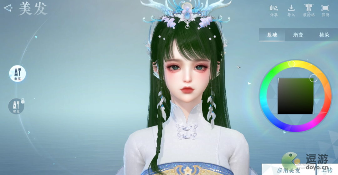 3、染发系统:可对发型做【基础发色】【渐变发色】【发色挑染】三个部分进行调整。但是相对来说可调整的颜色范围较小,仅有下图色圈内绿,蓝,紫,棕和灰色几款颜色可以选择,并且亮度相对较低