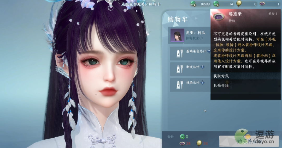 2、染发价格:从上图可以看到,染一次发型颜色需要24个【螺黛染】,【螺黛染】二测只能通过不绑定纹玉购买。一个【螺黛染】售价50不绑定纹玉,24个=1200不绑定纹玉=120R。