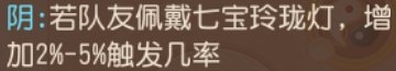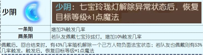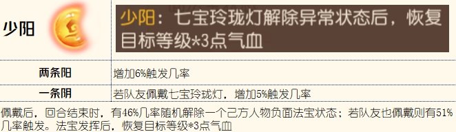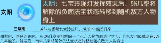 太阴触发还有较小概率将法宝状态转移给敌方。不过太阴的触发概率比较低,需要队伍中另外还有七宝的情况下概率会比较高,而且是理论上概率上限最高的也是太阴