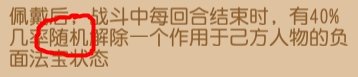 佩戴后,回合结束时,有40%几率随机解除一个作用于己方人物的负面法宝状态
