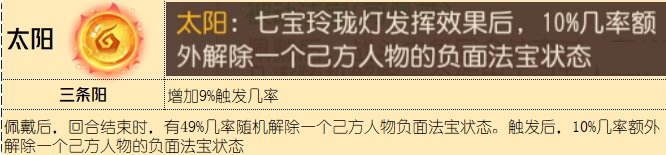 其实大多数玩家就算不佩戴七宝,五个法宝槽也是不够用的,所以一个队伍大概率只能挤出一个位置佩戴法宝,在只有一个玩家佩戴时,太阳触发的概率是最高的。