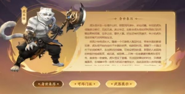 在新版本中,迎来了首个拥有双形貌的角色——虎头怪!除经典的玄黄色皮肤外,角色还新增一款皓白皮肤供选择。虎头怪力大无穷,擅长使用一柄长斧,可加入狮驼岭和花果山。