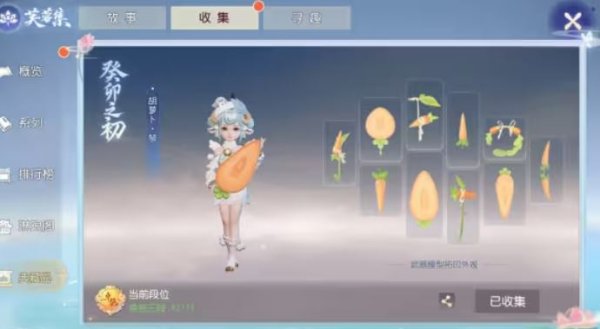 此次维护后,芙蓉集也迎来了全新的页签,名为[典藏品],用来展示根据玩家的风姿值段位所获得的外观奖励。现在,若少侠们的风姿值达到卓绝二段,就可以在该页签中以980仙玉的价格直接购买癸卯年的纪念武器外观。以兔年为主题元素,一系列的胡萝卜外观充满趣味。
