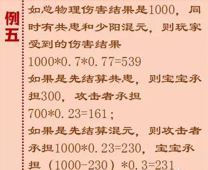 先结算共患,自己的宝宝承担的伤害更多一样,如果先结算混元伞,则攻击者承担的伤害要多一些