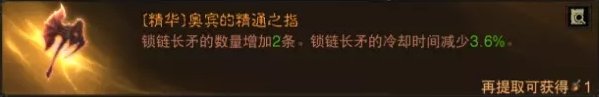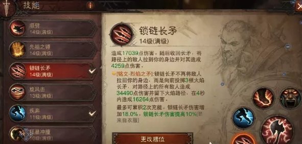 技能依然选择带锁链长矛放弃旋风击,搭配鲨鱼头锁链长矛可以提升38%的伤害,缺点是没有带副手精华奥宾的精通之指锁链长矛只有3根