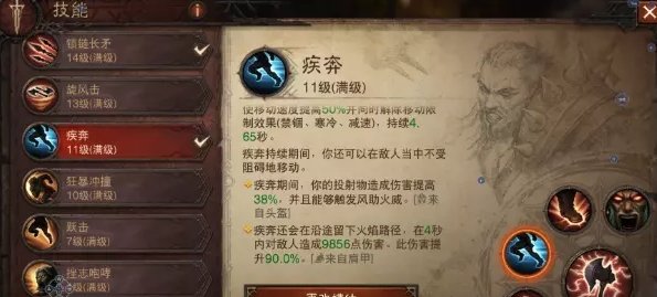 疾奔是我们的触发核心技能,因为开了疾奔才有鲨鱼头的投掷物效果,疾奔留下火焰路径在前面也提到是为了搭配普攻狂乱的冲击波达到普攻触发风火助威。