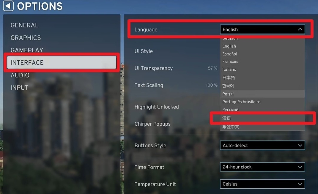 在OPTIONS界面左侧找到【INTERFACE】,打开之后即可在第一项【Language】处选择【汉语】,即可将游戏语言更改为简体中文。