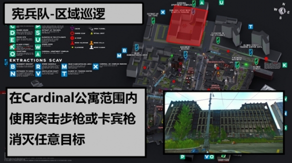Gendarmerie distric patrol 宪兵队-区域巡逻 在街区Cardinal公寓区域使用突击步枪或突击卡宾枪消灭任意目标